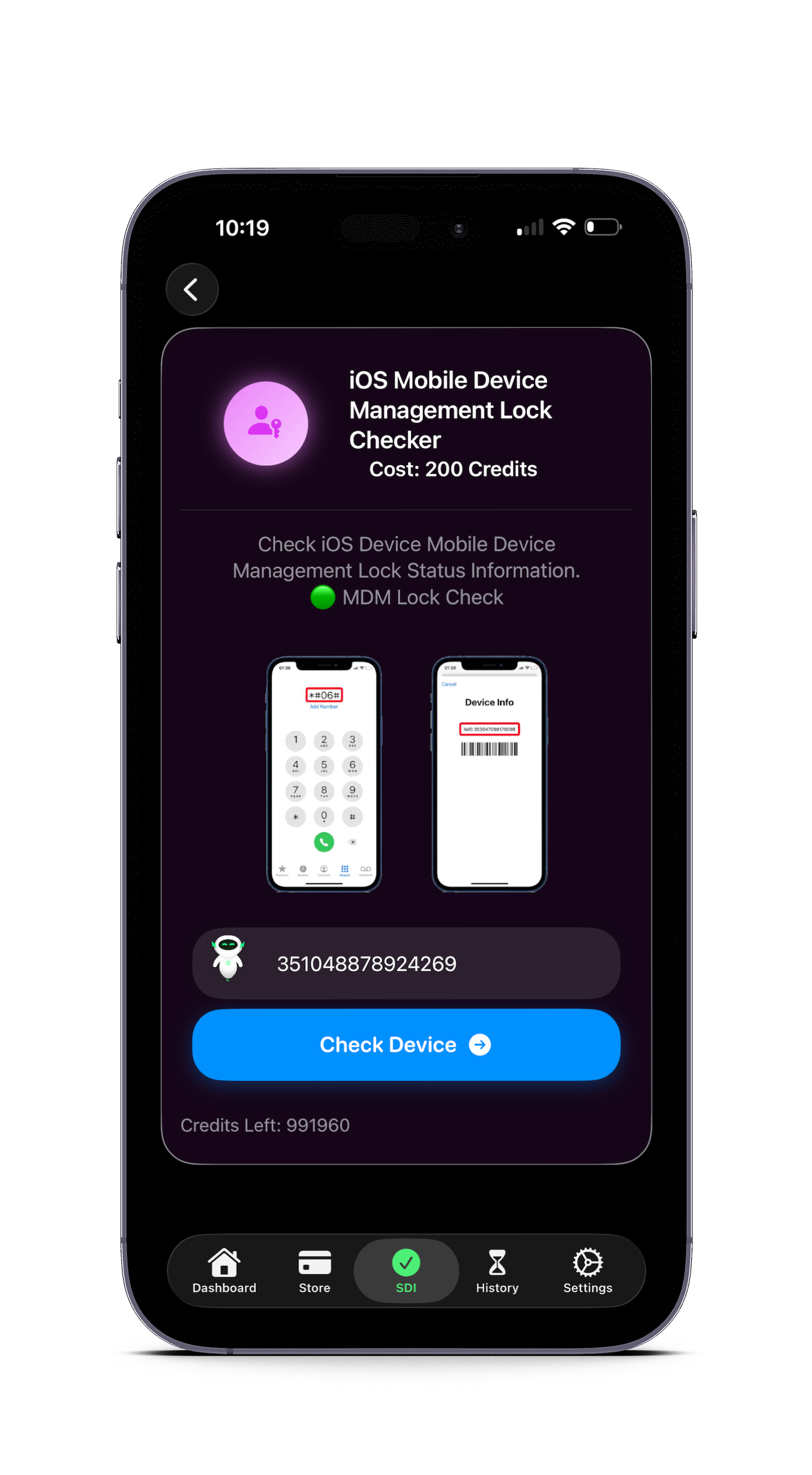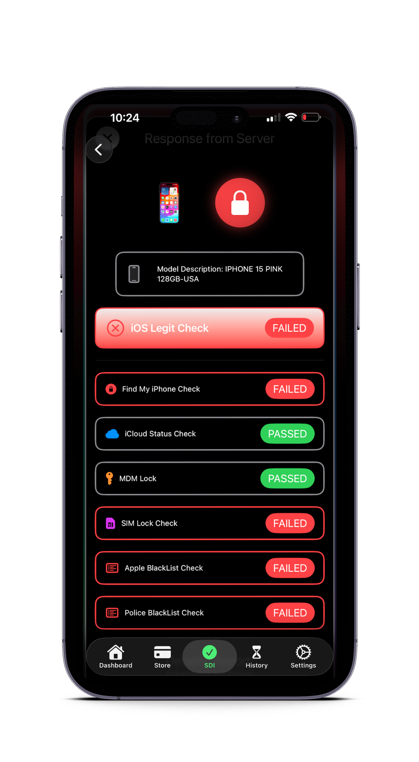 This tool analyzes device identifiers, serial number patterns, and previous iCloud account configurations to detect stolen devices that may look identical to genuine iPhones but contain previous owner iCloud or MDM lock on the device.